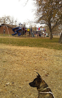 The dogs were having a fantastic time exploring the grounds. There were plenty of things to sniff and lots of trees to investigate. A playground sat near the middle of the park.