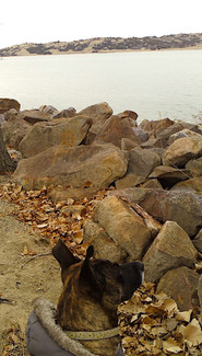 The American Creek Recreation Area was more like a big park. The Missouri River made up a large border of it. A small beach sat at one end. Unfortunately dogs weren't allowed on the beach, but the girls didn't seem to mind. They happily explored the rocky shoreline instead, searching for critters and briefly testing the water. The river was much too cold for swimming during our visit anyways.